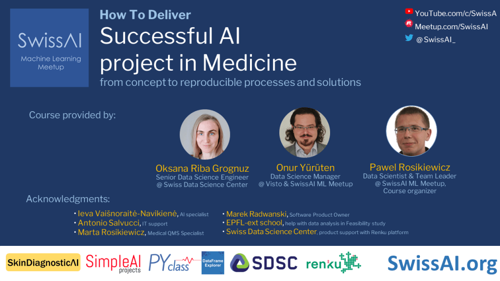 On 27-04-2021, within the programme of Applied Machine Learning Days 2021, I have delivered a full-day workshop with the title “How to Deliver Successful AI Projects in Medicine”. The workshop was delivered online, bearing in mind the precautions against COVID. I had the privilege to collaborate with Pawel Rosikiewicz and Oksana Riba Grognuz, my co-associates from SwissAI.